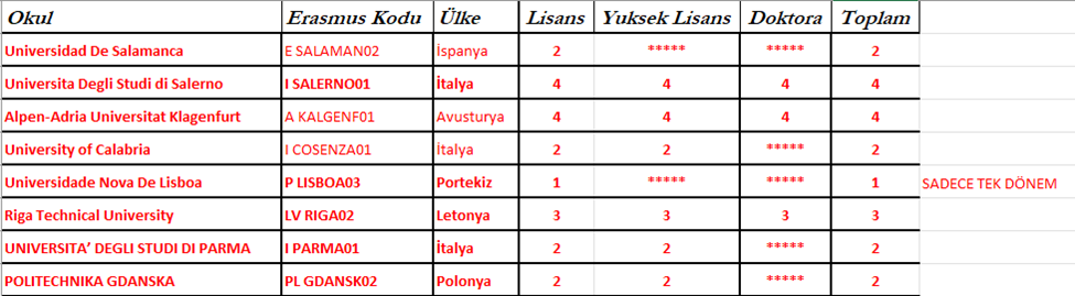 - 19 Mart 2024 Salı günü saat 15:00’da A1-01 Butik Sınıfta gerçekleştirilecek toplantıda öğrenci tercihleri alınacaktır. Tercihler başarı sırasına göre sırayla alınacaktır. Bu sebeple ERASMUS faaliyetinden faydalanacak öğrenciler tercihlerini gerçekleştirmek için bu toplantıya katılmalıdır. Toplantıya katılmayan adaylar ERASMUS faaliyetinden faydalanamayacaktır.