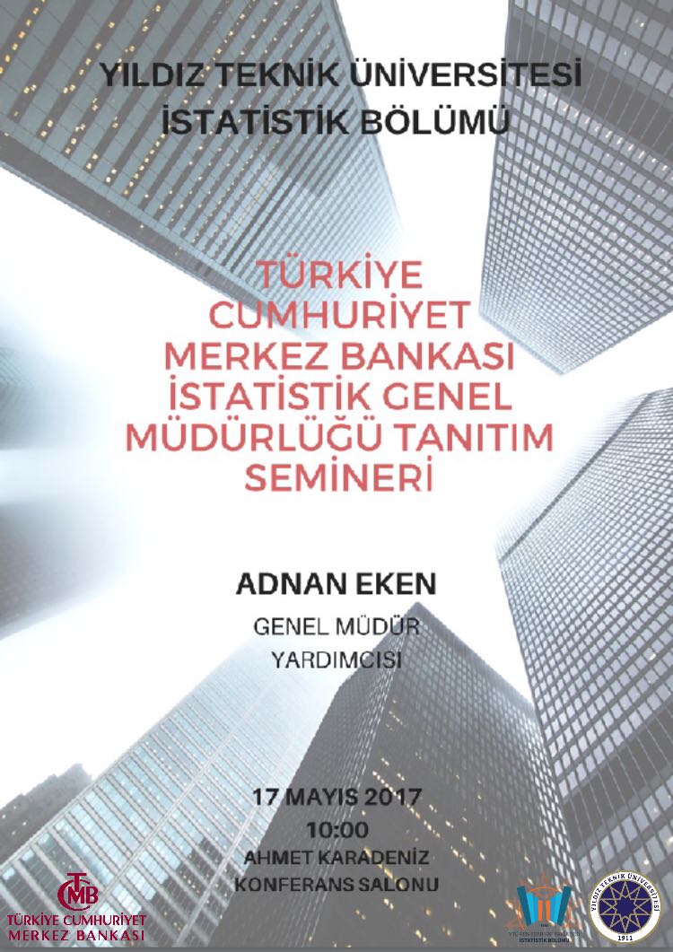 18 Mayıs 2017 Perşembe günü saat 14:00 da, Ahmet Karadeniz konferans salonunda, T.C. Merkez Bankası İstatistik Genel Müdürlüğü tarafından tanıtım semineri yapılacaktır. Tüm YTÜ İstatistik Bölümü ailesi davetlidir.