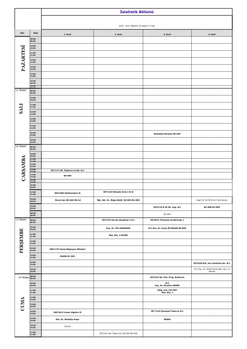 20-21 Nisan 2017 Tarihleri arasında yapılacak olan "14. Uluslararası İstatistik Kolokyumu" dolayısıyla, 19- 20-21 Nisan Tarihlerinde yapılması planlan dersleri vizeleri 12-13-14 Nisan tarihlerinde; 16-17 Nisan'da yapılması gereken BÖLÜM İÇİ vize sınavları 24-25 Nisan 2017 Tarihlerinde yapılacaktır.