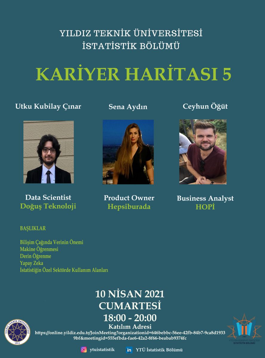 Bölümümüz tarafından bu sene 5.'si düzenlenecek olan Kariyer Haritası etkinliğinde sizi sektörün önde gelen firmalarından olan Doğuş Teknoloji, Hepsiburada ve Hopi'de kariyerlerine devam eden mezunlarımız ile buluşturacağız. Bilişim çağında, istatistiğin özel sektörde kullanım alanlarının yanı sıra, verinin ve istatistiğin öneminin konuşulacağı etkinliğimize hepinizi bekliyoruz.